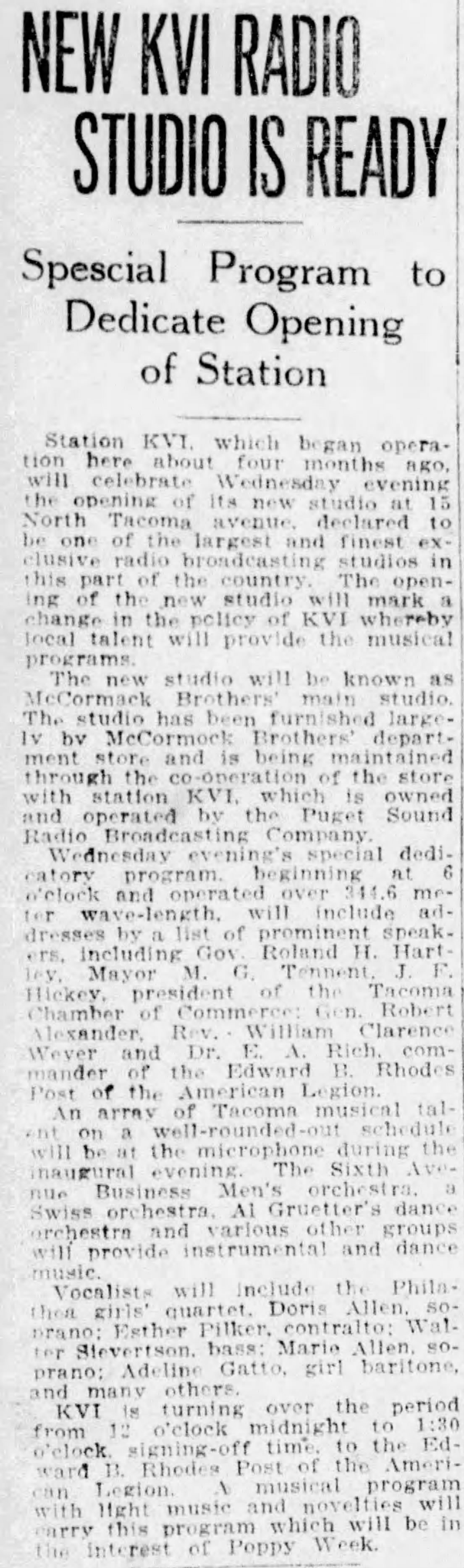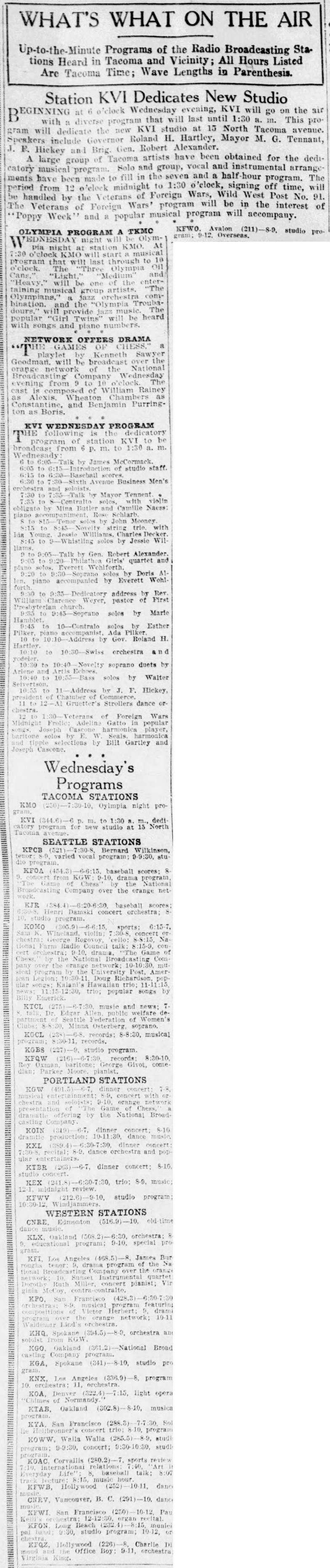 1927 – KVI Tacoma goes on the air Jason Remington April 24, 2026 February 12, 1927 – Tacoma Ledger May 24, 1927MAY 25, 1927 Share this post: Jason Remington(((Admin/Editor | Airchecks | CONTACT))) KTOY (WA) | KVAC (WA) | KDFL (WA) | KONP (WA) | KBAM (WA) | KJUN (WA) | KRPM (WA) | KAMT (WA) | KASY (WA) | KBRD (WA) | KTAC (WA) | KMTT (WA) | KOOL (AZ)