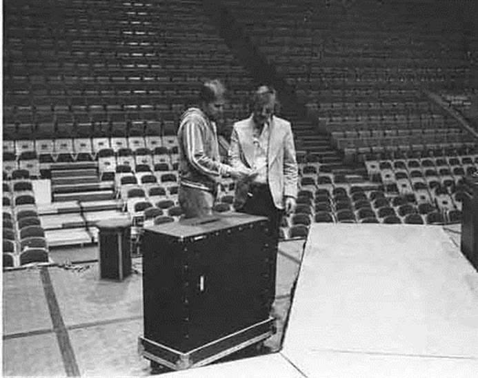 I had one other major problem. Frank had insisted on using his sound company from Las Vegas, Bob Kiernan. Bob was a nice enough guy but he was familiar with working Las Vegas size arenas, not twenty-thousand seat coliseums. He never had enough sound to fill the halls and I used to marvel that the greatest entertainer of his time was using a sound company that on most nights was very inadequate. We had a joke on the tour. “What’s the Bob Kiernan sound system look like?” Someone would put together two paper cups. “What’s the Bob Kiernan sound system for arenas?” Another cup would be added. “What’s the Bob Kiernan sound system for coliseums?” A fourth cup was thrown in. Backstage humor that was painfully funny if you were close to the action. The miserable sound system that Kiernan used often led to refunds to the customers that couldn’t even hear Frank which was another needless headache as well as embarrassment.