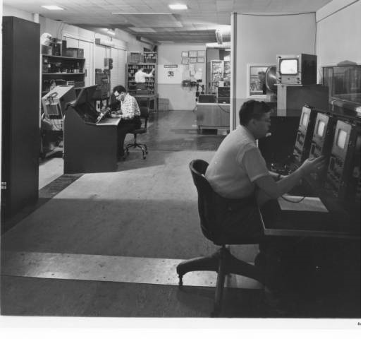 Interiors of KTNT TV, Tacoma, studio. Several employees work in a technical capacity on Channel 11’s broadcast. KTNT, owned by the Tribune Publishing Co., offered a wide variety of programming including Red Buttons, Burns and Allen, Jackie Gleason, the Romper Room and the locally produced Home Show. Broadcasts could be seen from Vancouver, B.C., to Portland, Oregon.