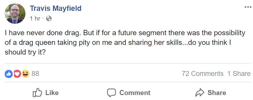 I suppose a real news person might ask, “Is it news-worthy and would the majority of the viewers find it applicable to their interests or how it might be useful information for those viewers.” In other words, the world does not revolve around Travis Mayfield, the gay community and alternative lifestyles. So, since you appear on a news program, stick to the news. These features are only to promote a certain agenda and are NOT NEWS-WORTHY and NOT OF INTEREST TO THE MAJORITY OF VIEWERS.