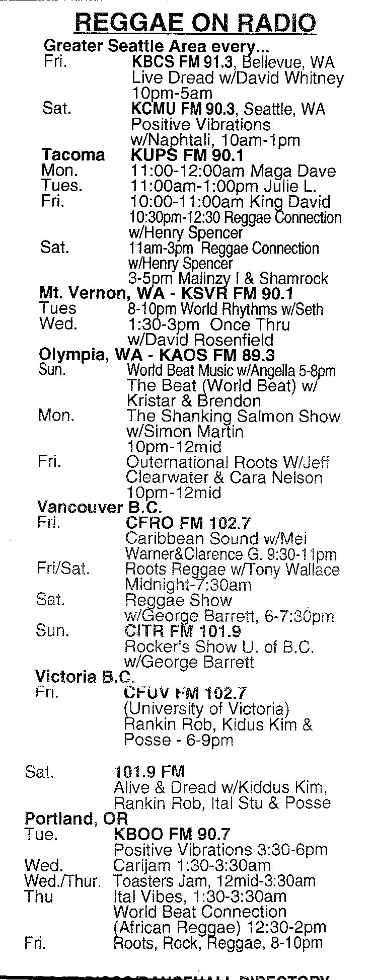 listing of reggae & African music shows on Pacific Northwest radio in Seattle-based music newspaper “Rhythmicentric“
