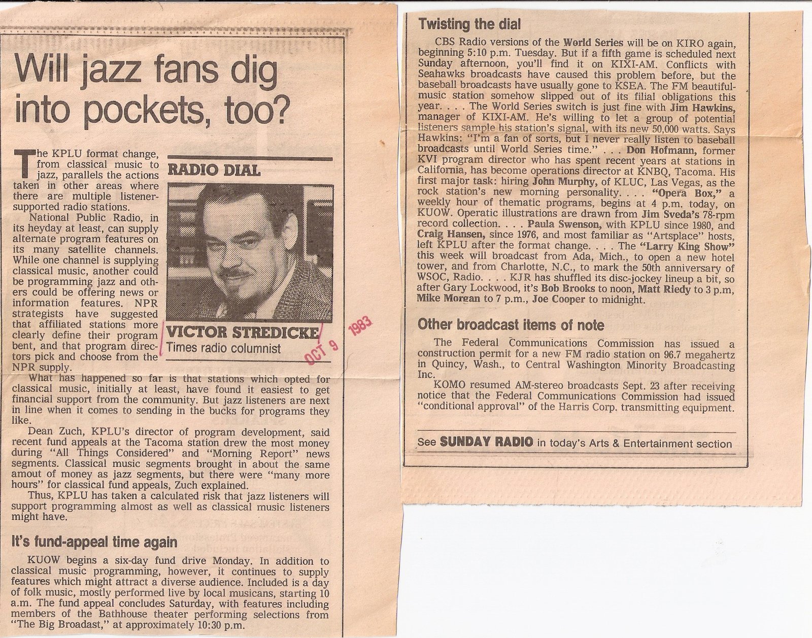 Victor’s opening question about sustaining jazz could now probably be answered with a “yes” albeit in small letters as compared to the station’s news & talk supporters’ response “YES” The news & talk programmming has slowly been taking over much of the air time once offering jazz, to my personal dismay. From a popularity & preference stand-point, I am in the minority. However, just as I begin pondering whether KNKX will drop jazz & blues altogether, they hire one of our region’s top jazz programmers & air personality Carol Handley to guide the station. Among some new jazz programs, the chance for a school student to DJ on 88.5 Thur’s evenings plus Jim Wilke & Ken Wiley’s continued excellence in programming suggest music is here to stay, in spite of the overwhelming support for news/talk. I was going to make these comments below on Jason’s post noting KNKX’ first year of operation as a community broadcaster. However, it seemed more appropriate to compliment Victor’s article.