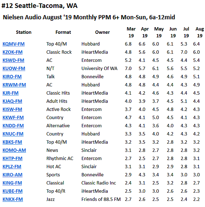 Here’s a sample of the August 2019 Nielsen Audio Ratings for the Seattle-Tacoma Metro. The far right column shows who is on top at the moment, ranked highest to lowest, but the other columns demonstrate the ebb and flow of the market. Our list here at QZVX is limited to ONLY the Top 20 stations. There are other stations ranked, down toward the bottom, but since posting that would make the survey really long we are cutting it off as is. Note that currently they are sampling listeners 6+ years of age. That is a fairly recent change from the long time practice of sampling listeners 12+. Lowering the demo to include children just out of kindergarten increases the perception of the number of people who listen to radio — with fierce competition from other media, market fragmentation and shrinking shares — the theory is that change in methodology will help radio broadcasters.