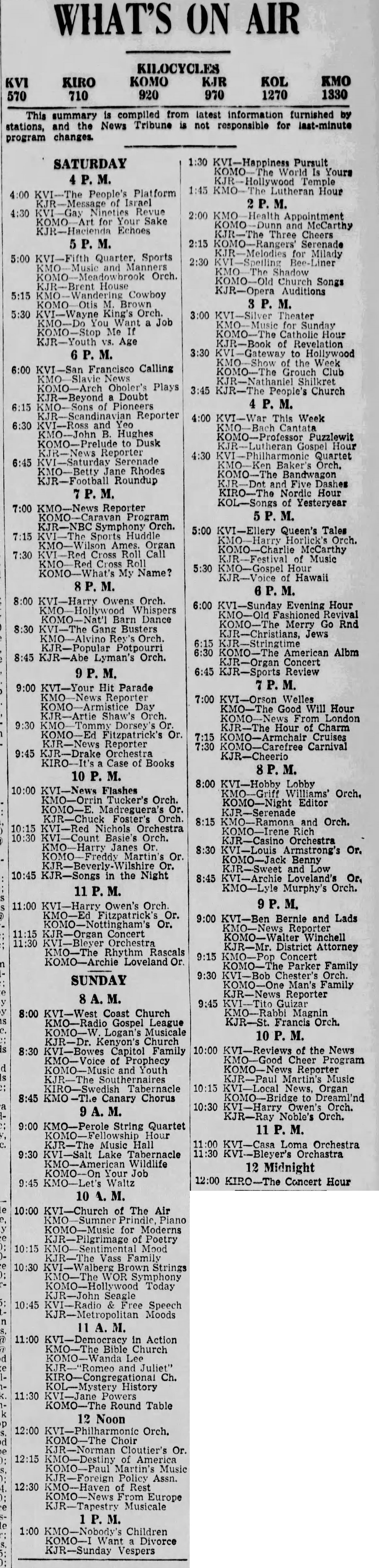 November 1939 Radio Listings Jason Remington November 24, 2021 Tacoma News Tribune Share this post: Jason RemingtonAdmin/Editor | Airchecks KTOY (WA) | KVAC (WA) | KDFL (WA) | KONP (WA) | KBAM (WA) | KJUN (WA) | KRPM (WA) | KAMT (WA) | KASY (WA) | KBRD (WA) | KTAC (WA) | KMTT (WA) | KOOL (AZ)
