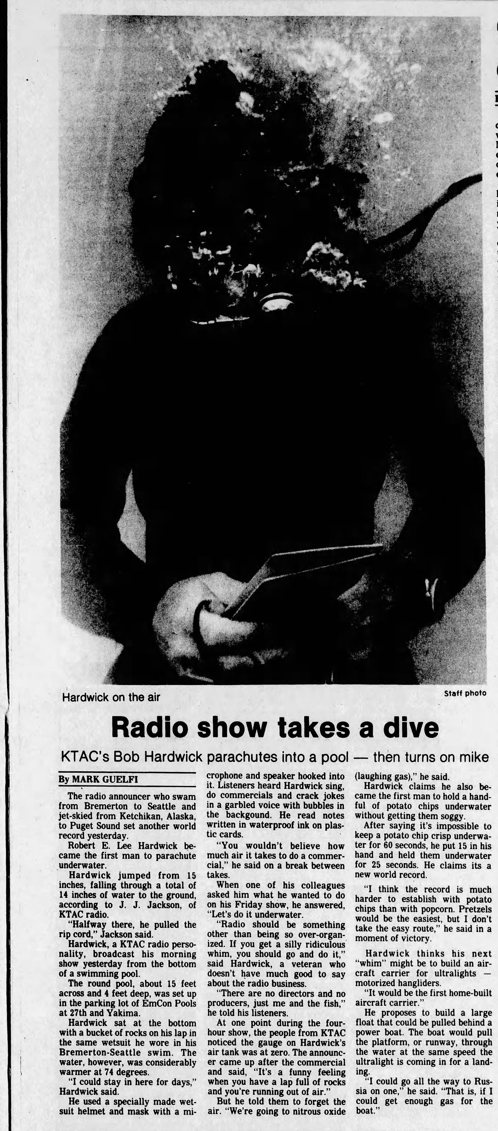 On his KVI morning show, Hardwick would sometimes play only two or three records an hour. The rest of the time was filled with jokes, skits, ad-libbed advertisements and promotions for his latest escapade. In 1965, Hardwick piloted a tugboat to British Columbia to haul back Namu, the killer whale, for the Seattle Aquarium.