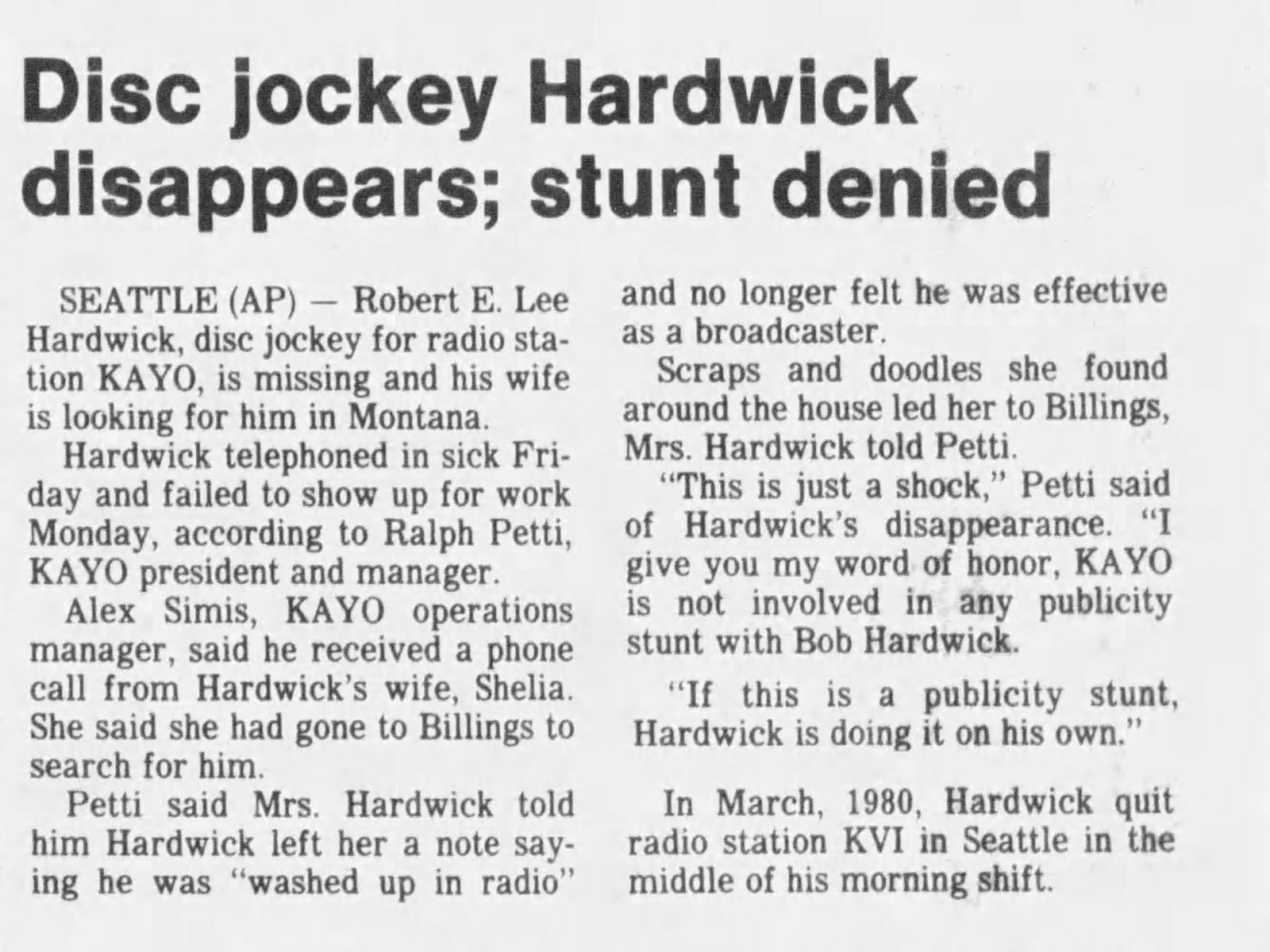 Longtime Seattle radio personality Bob Hardwick was found dead of a self-inflicted gunshot wound yesterday, Chelan County Sheriff’s Detective Bill Patterson said today. Robert E. Lee Hardwick, 61, of Kent, was once the king of Seattle morning radio, making his mark on KVI-AM. In 1978 he was Billboard magazine’s Radio Personality of the Year.