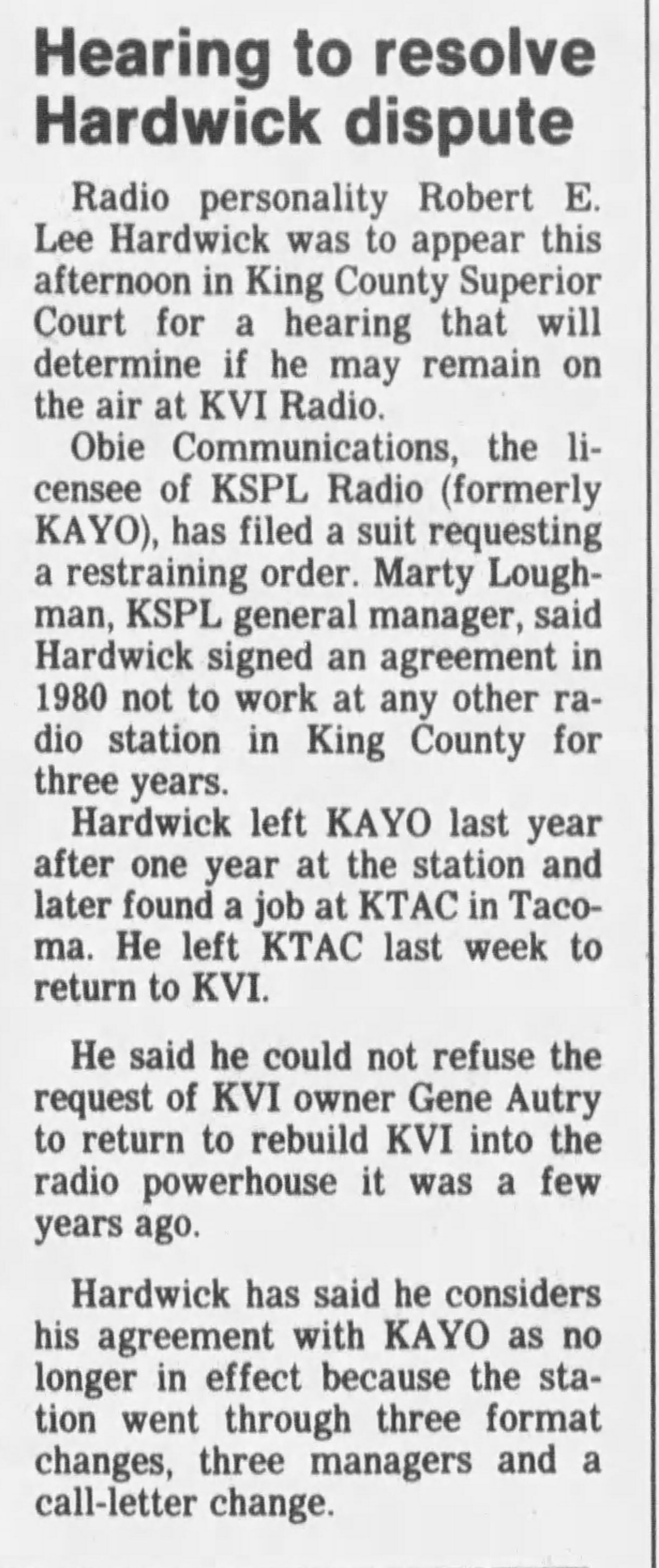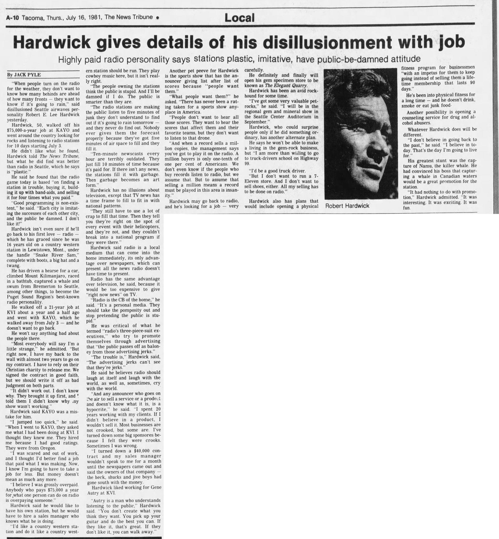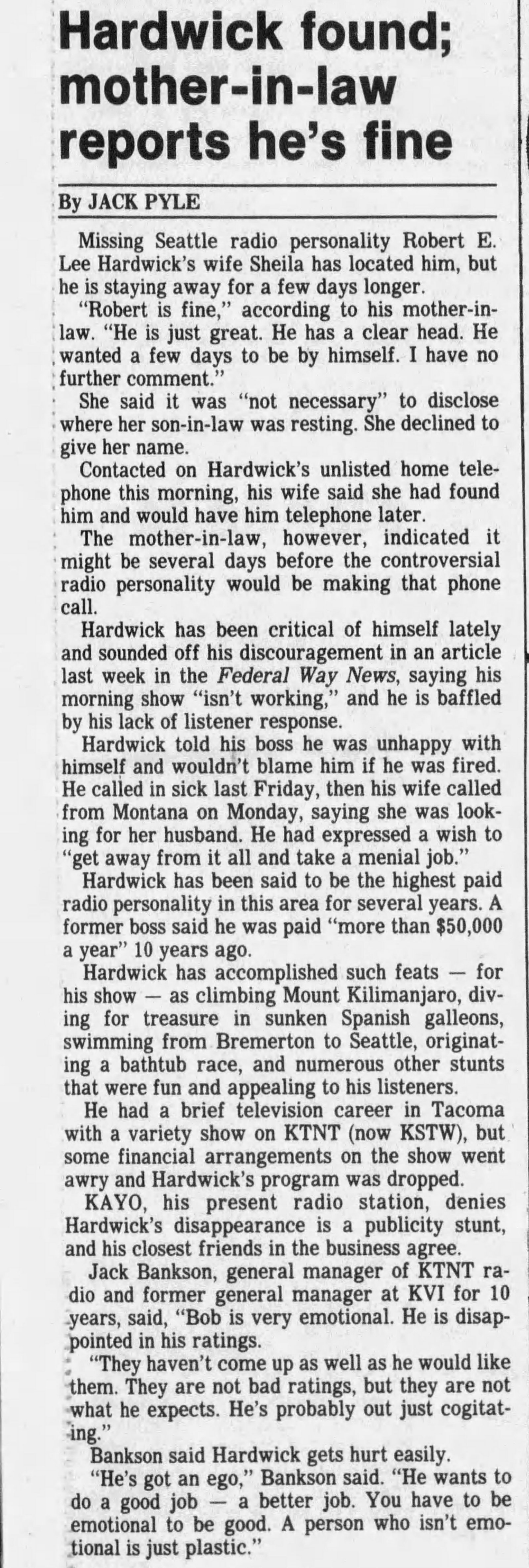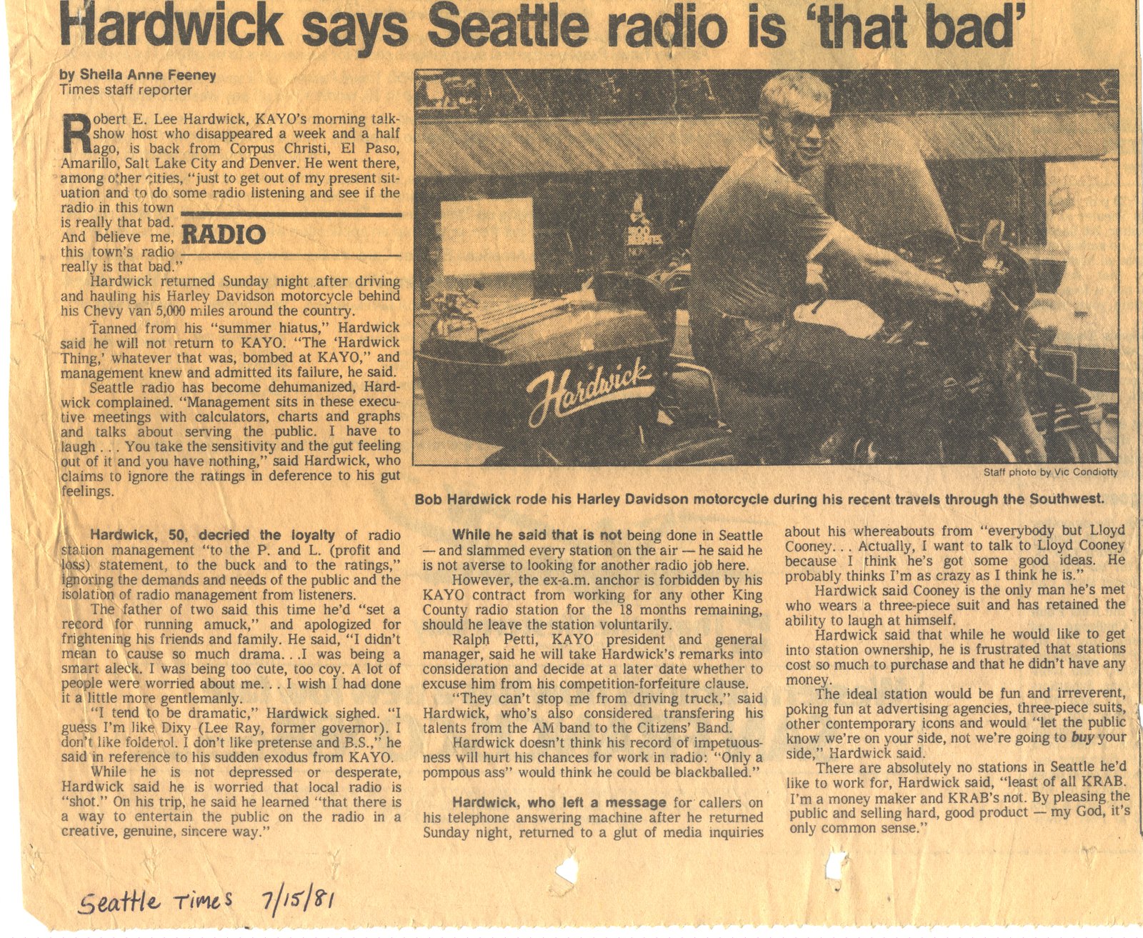 This is one article I do not remember. I read most of Victor Stredicke’s columns from that period, but somehow missed this by Sheila Feeney. (Thanks, Sam Lawson for sending this.) Hardwick hated Seattle radio, but would work for the right station, if, but they are all crap. OK then.