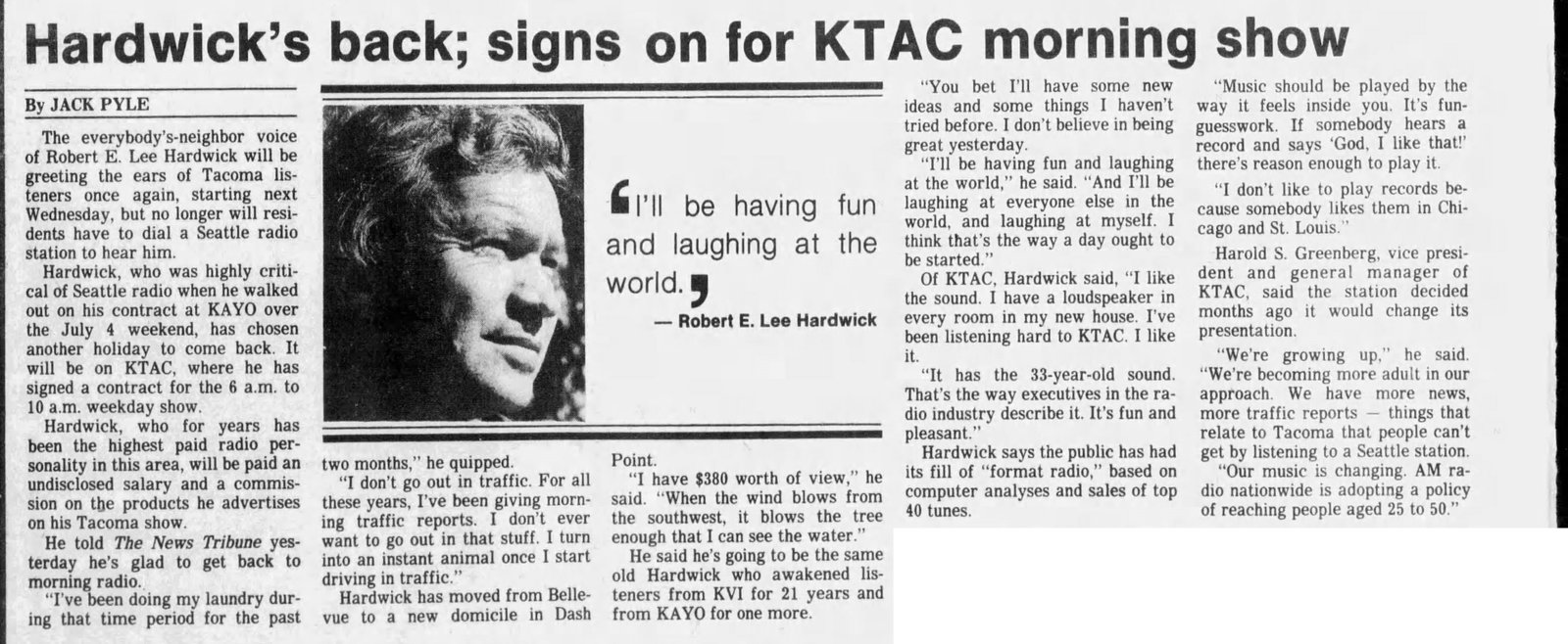 1984 (August) Bob Hardwick approached owners of radio stations KMO and KTAC Tacoma with an interest in purchasing one of the stations. Nothing became of those talks.