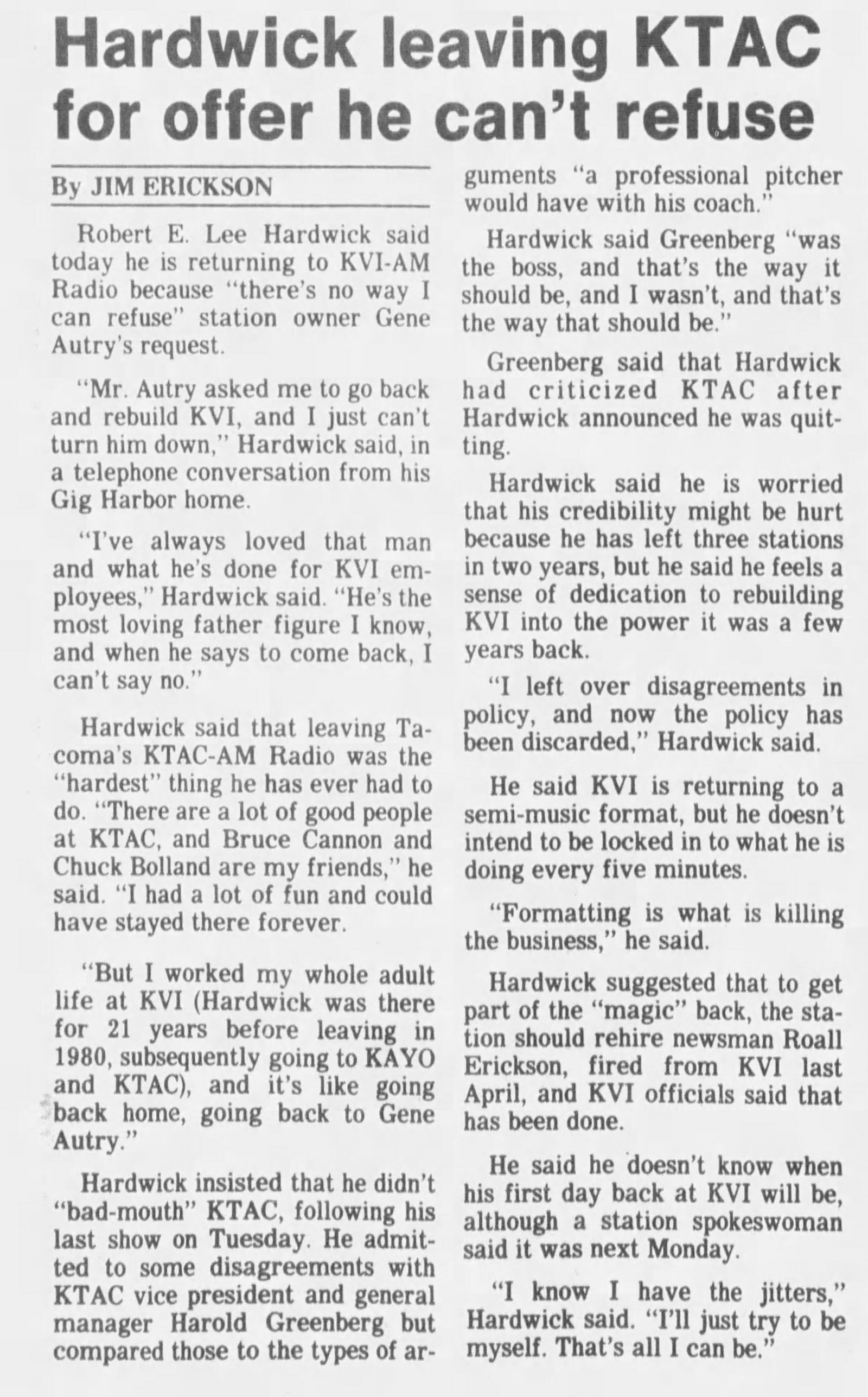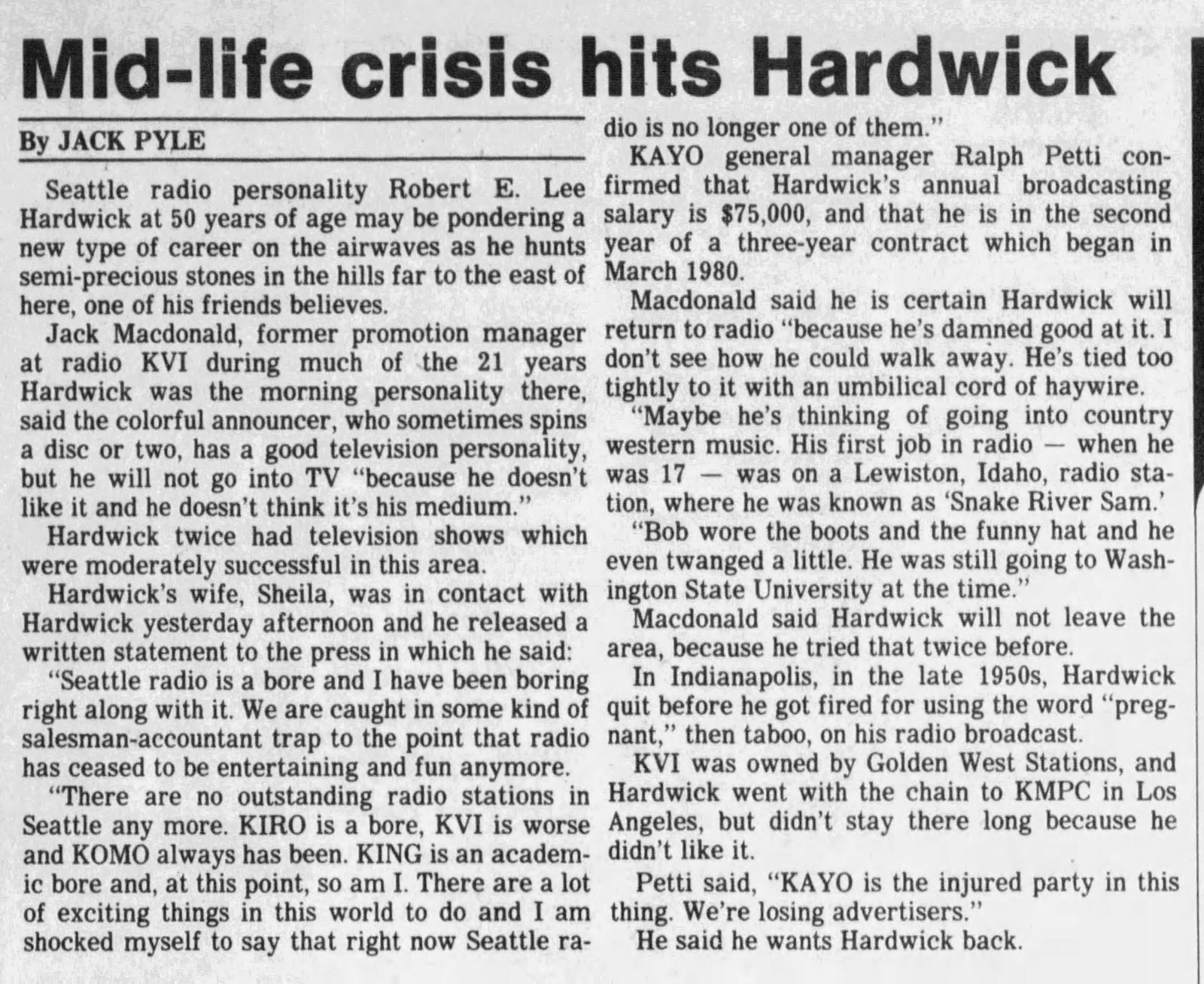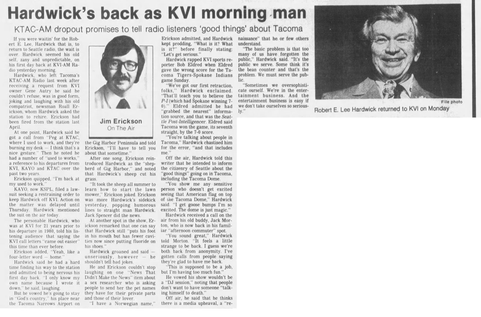 Hardwick worked at KVI from 1959 to 1980. Those 21 straight years were interrupted only by a four-month sojourn at Los Angeles station KMPC-AM in 1963.