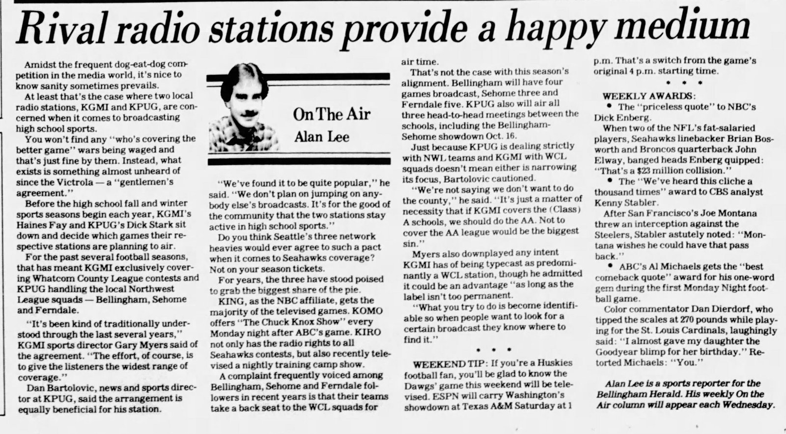 1987: Bellingham Radio Covers High School Sports Jason Remington February 25, 2023 Sep_16__1987-Bellingham Herald Share this post: Jason RemingtonAdmin/Editor | Airchecks KTOY (WA) | KVAC (WA) | KDFL (WA) | KONP (WA) | KBAM (WA) | KJUN (WA) | KRPM (WA) | KAMT (WA) | KASY (WA) | KBRD (WA) | KTAC (WA) | KMTT (WA) | KOOL (AZ)
