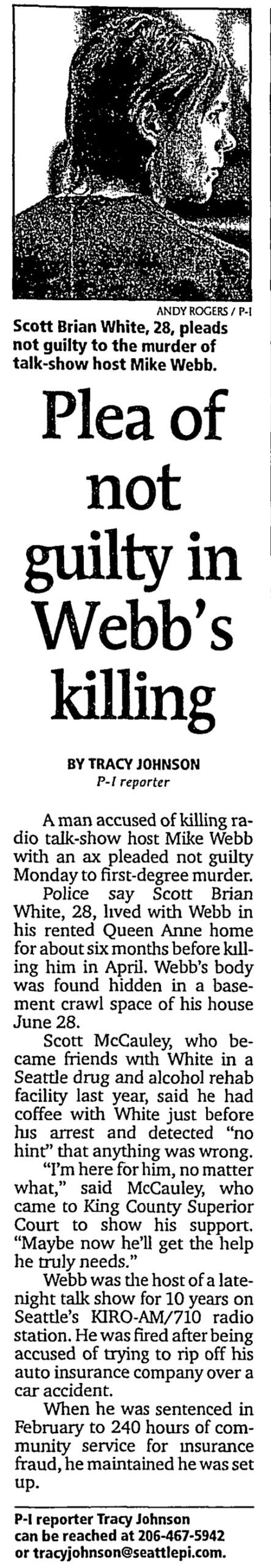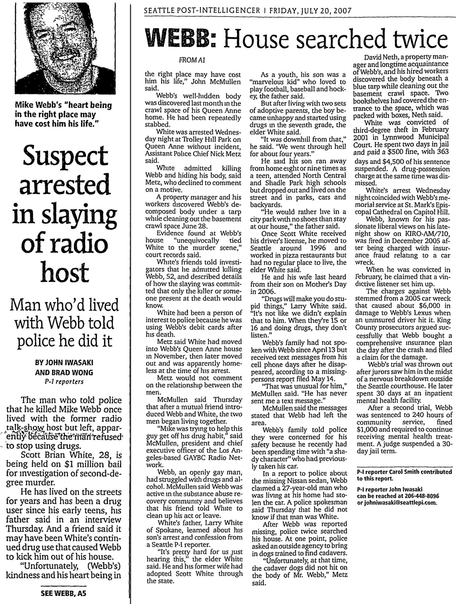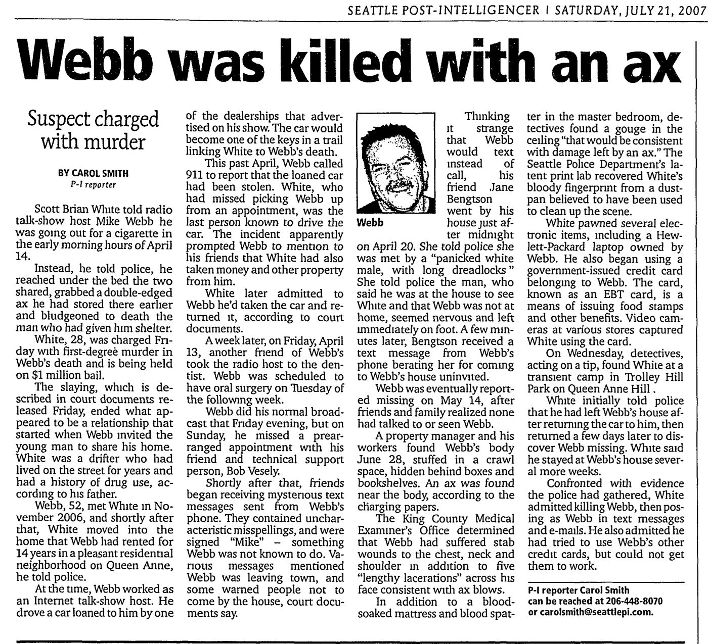 Scott Brian White, 29, was living at Webb’s Queen Anne home in the months before Webb’s body was found dismembered in the crawlspace under the house.
