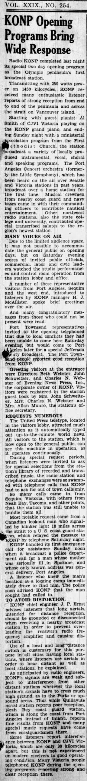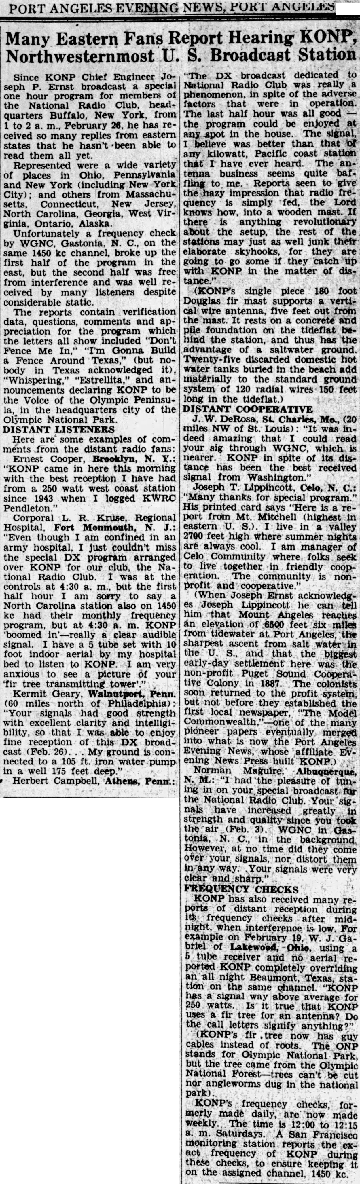 80 Years for KONP/Port Angeles; Dedicatory program listings; Unique antenna & ground system; Nationwide DX’ers report KONP reception