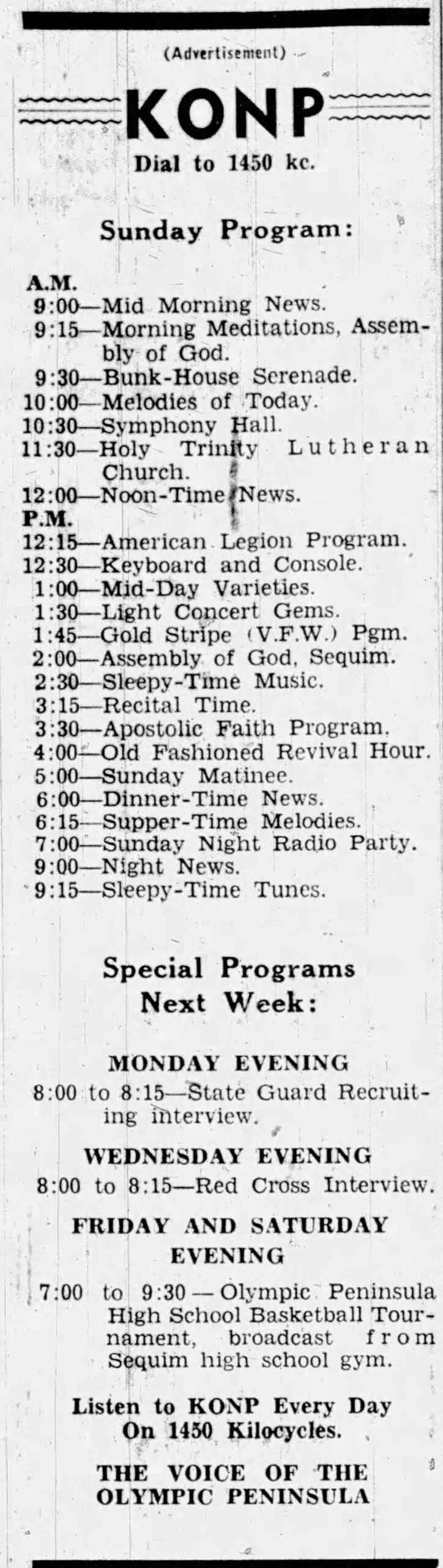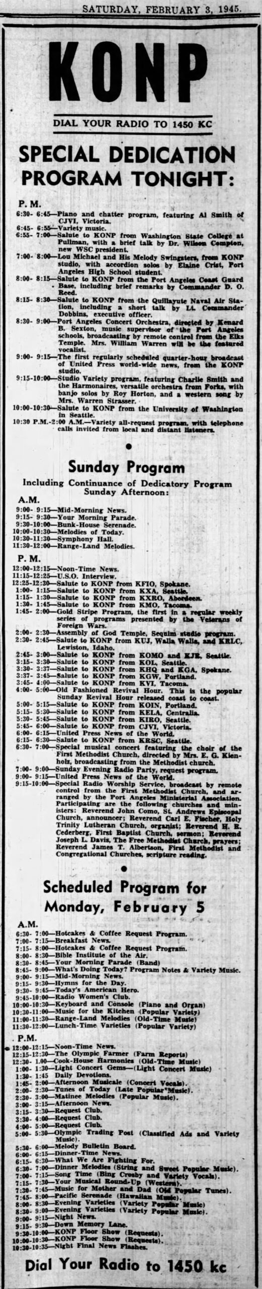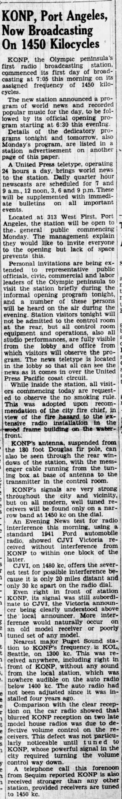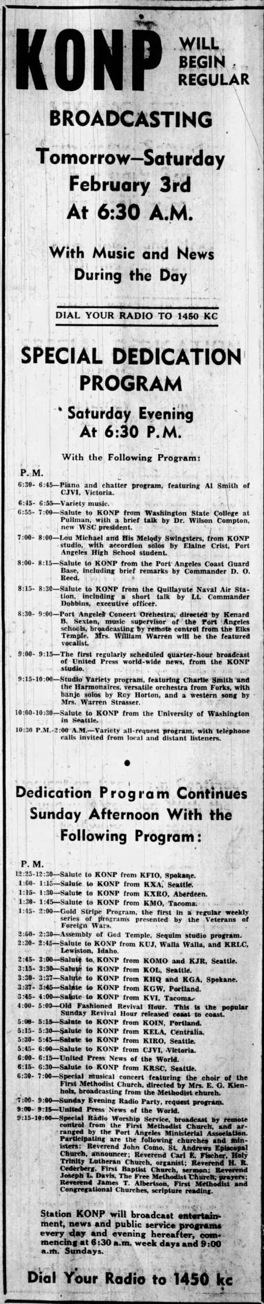 KONP-AM (1450 kHz) Port Angeles is celebrating its 80th anniversary of service to the Olympic Peninsula. The station commenced broadcasting at 6:30 am on February 3, 1945, after an eight-year effort by Evening Press, Inc., a subsidiary of the Port Angeles Evening News, to bring the first radio service to the city of Port Angeles.