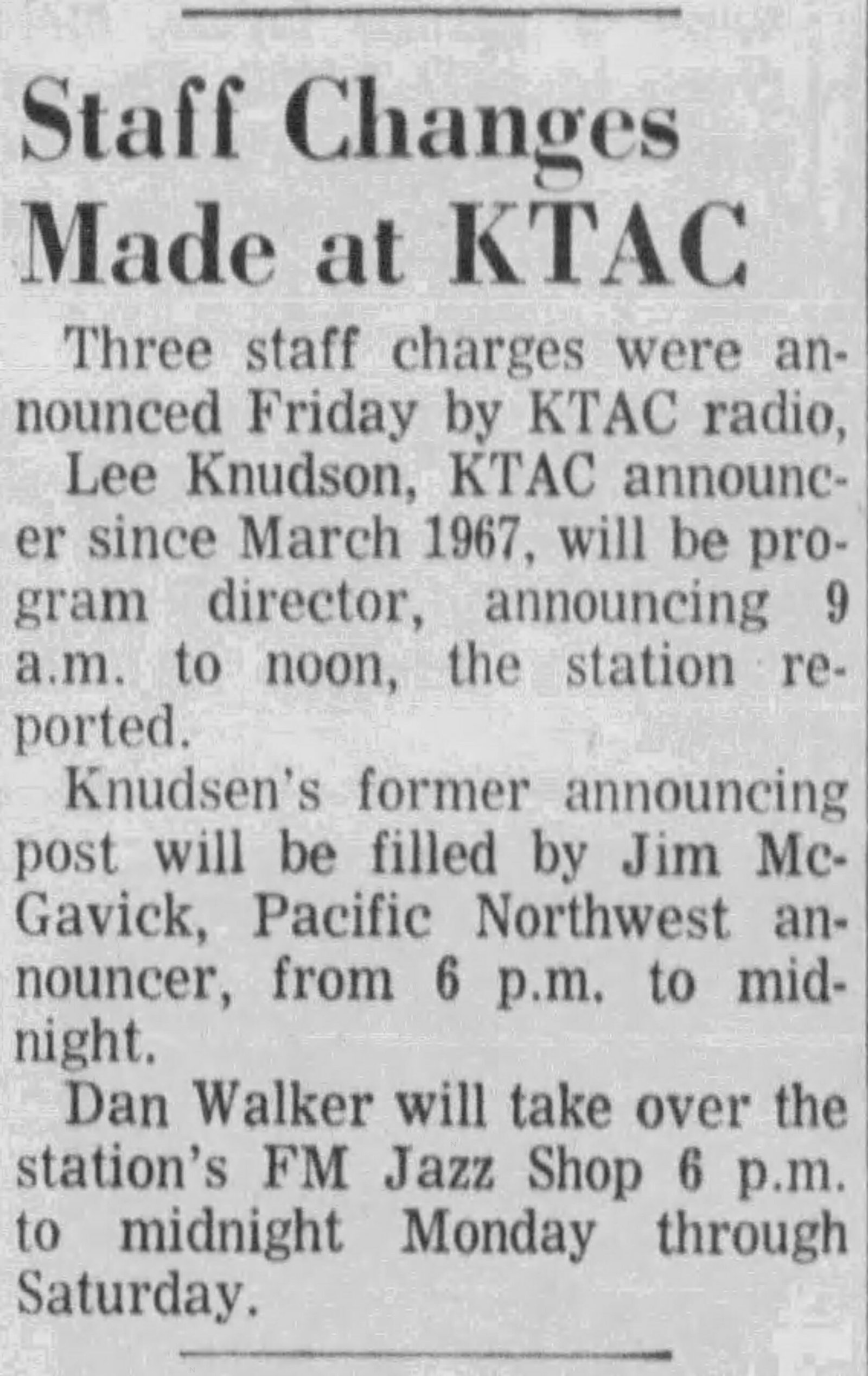 Staff changes at KTAC (1968) Jason Remington February 17, 2025 June 14, 1968 Share this post: Jason RemingtonAdmin/Editor | Airchecks KTOY (WA) | KVAC (WA) | KDFL (WA) | KONP (WA) | KBAM (WA) | KJUN (WA) | KRPM (WA) | KAMT (WA) | KASY (WA) | KBRD (WA) | KTAC (WA) | KMTT (WA) | KOOL (AZ)