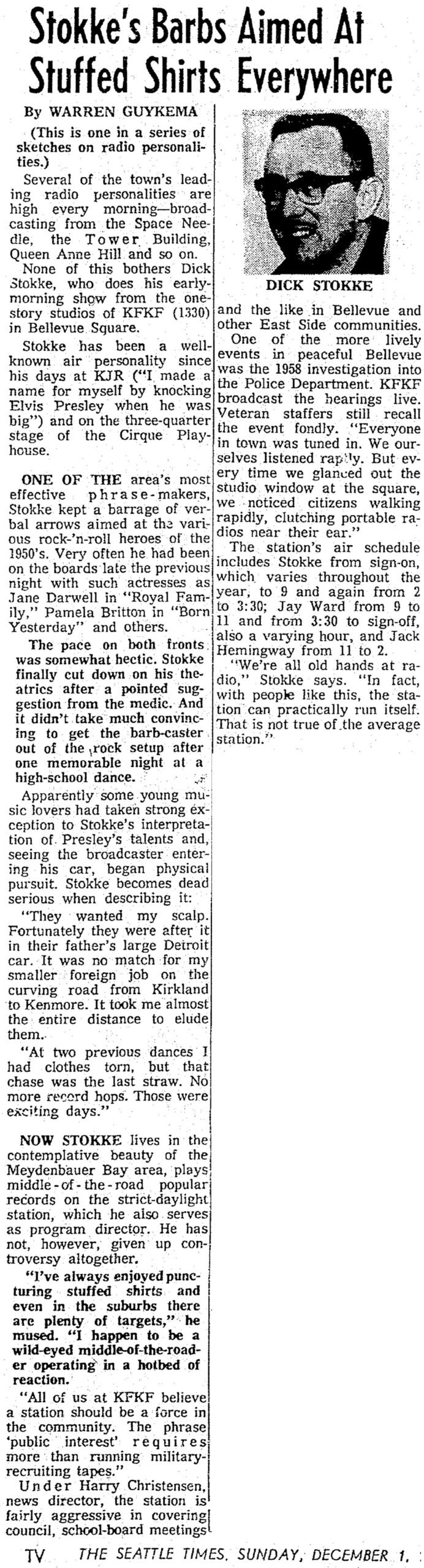 My dad, who hated rock and roll, was driving us somewhere and I changed the radio from the news to KJR. Dick Stokke played an Elvis record and called him Elmo Pushley. My dad cackled like a maniac. [Comment Title: Stokke making fun of Elvis]