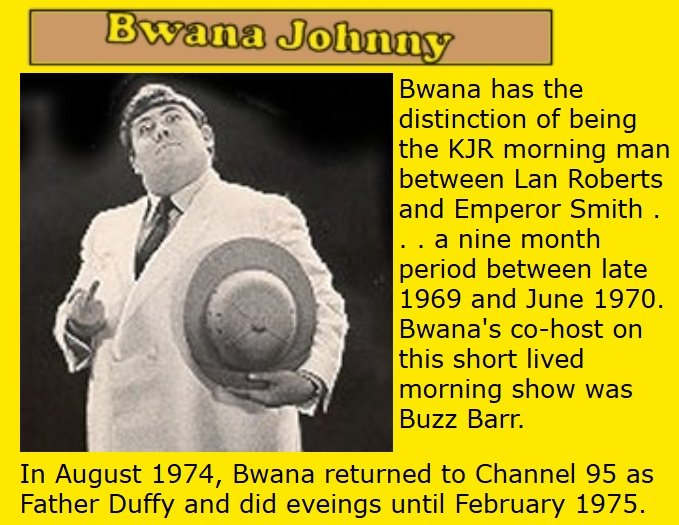 Lee “Emperor” Smith was the KJR morning man from late 1969 to early 1974. He arrived from Spokane to take over from the short lived Bwana Johnny and “retired” to the KJR sales department four years later.