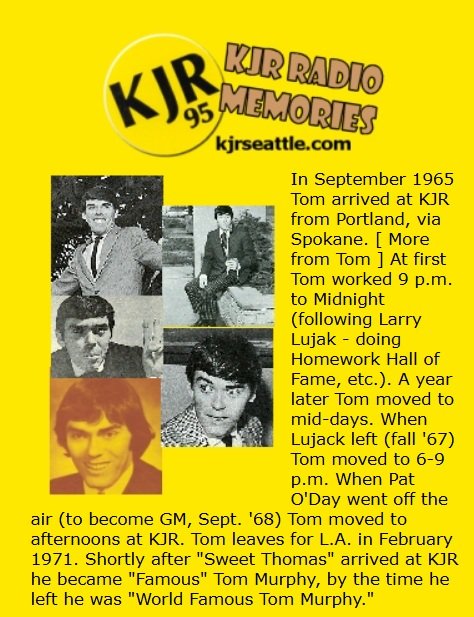 “At the time, Spokane’s KNEW included Jim Sims who went to KJR and then returned just like Charlie Brown and Mike Dalton. Emp (Lee Smith) joined KNEW as did Tom Murphy before the call letters were changed to KJRB – that was 1966. I think Tom went to Seattle at that time, I do recall telling Pat I could hire Tom because ‘Famous’ really needed a job and Pat said ‘God what a find.'”