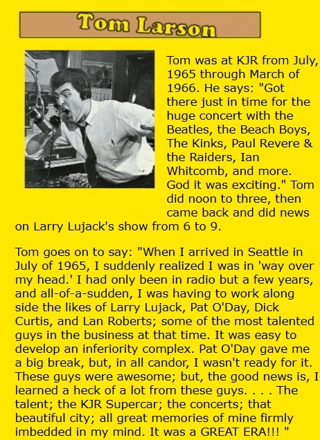 Tom Larson, who was at KJR in 1965-66 says: “Pat O’Day used to say in DJ staff meetings that Larry Lujack, was, ‘pound-for-pound,’ the finest DJ on the West Coast. I came to believe it. When every other DJ in Seattle wanted to get to L.A., Larry said his ultimate goal was Chicago. So, it was no surprise to me when he wound up there.”