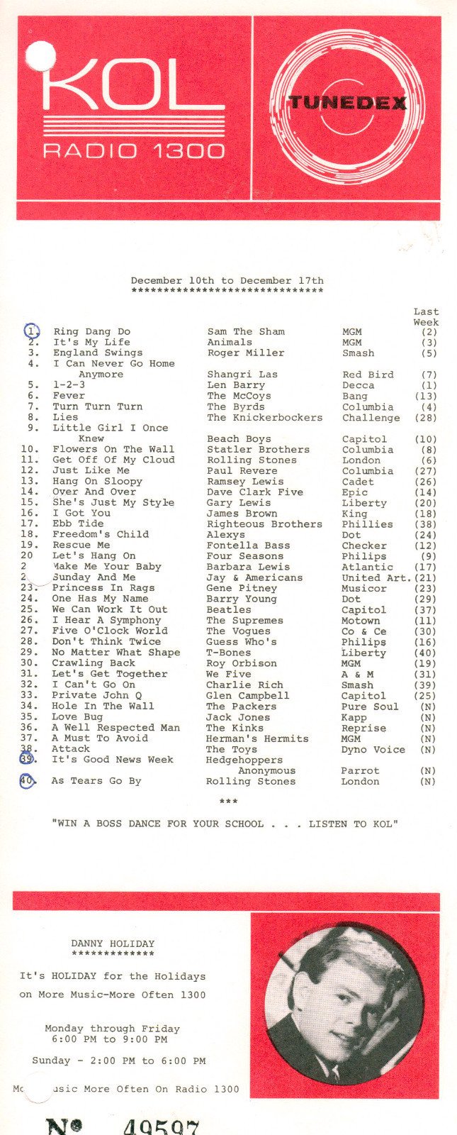 KOL TuneDex 1965 Danny Holiday Jason Remington May 3, 2025 Share this post: Jason RemingtonAdmin/Editor | Airchecks KTOY (WA) | KVAC (WA) | KDFL (WA) | KONP (WA) | KBAM (WA) | KJUN (WA) | KRPM (WA) | KAMT (WA) | KASY (WA) | KBRD (WA) | KTAC (WA) | KMTT (WA) | KOOL (AZ)