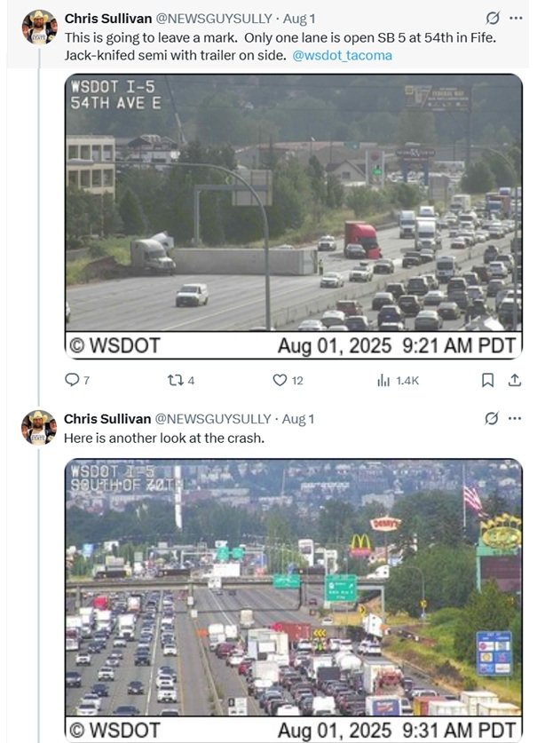 Chris Sulivan reports from the KIRO studios using traffic cams and other sources. The days of ‘eyes in the sky’ copters and planes are long past. KOMO 4 had a couple tragic outcomes with their copters years ago and have abandoned that method of reporting.