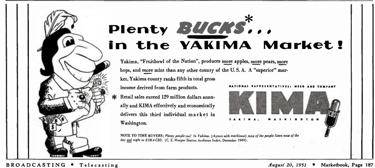 KIMA Yakima Broadcasting Magazine ad 1951 Jason Remington August 22, 2025 Share this post: Jason RemingtonAdmin/Editor | Airchecks KTOY (WA) | KVAC (WA) | KDFL (WA) | KONP (WA) | KBAM (WA) | KJUN (WA) | KRPM (WA) | KAMT (WA) | KASY (WA) | KBRD (WA) | KTAC (WA) | KMTT (WA) | KOOL (AZ)