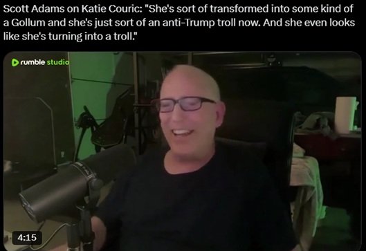 Scott Adams recognizes a troll when he sees one: Scott Adams on Katie Couric: “She’s sort of transformed into some kind of a Gollum and she’s just sort of an anti-Trump troll now. And she even looks like she’s turning into a troll.”