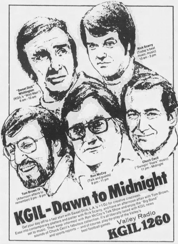 In its early decades, KGIL focused on music, news, and traffic reporting, becoming known for innovative airborne traffic reports using its own plane. Notable personalities included Dick Whittington (known as “Sweet Dick”), Wink Martindale, and even Francis Gary Powers (the U-2 pilot) as a traffic reporter in the 1970s. The station gained attention for its coverage of the 1971 San Fernando earthquake.