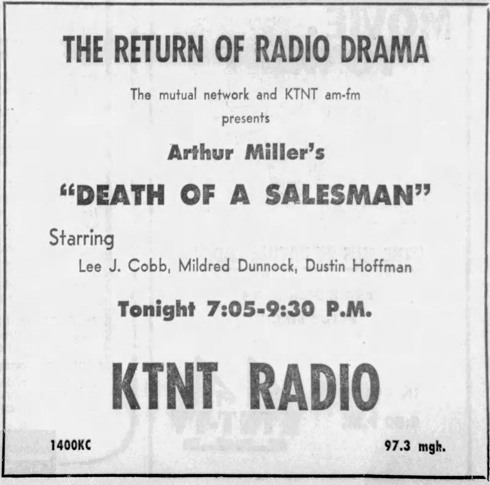 (May 17, 1970) Arthur Miller’s “Death of a Salesman” will be presented in its entirety Sunday from 7:05 to 9:30 p.m. on KTNT Radio AM and FM.The drama, starring Lee Cobb, Mildred Dunnock and Dustin Hoffman, will be a Mutual network production and represents a comeback for drama on radio, said a KTNT spokesman.