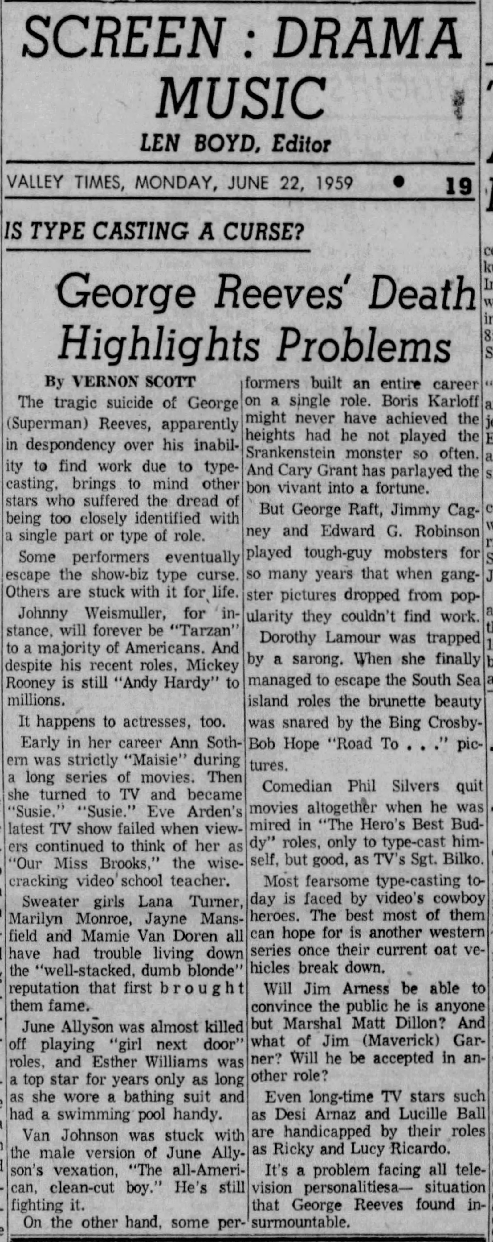 Typecast as Superman – George Reeves suicide (1959) Jason Remington January 30, 2026 Click articles to ENLARGELOS ANGELES EVENING CITIZEN, JUNE 16, 1959 LOS ANGELES TIMES – JUNE 24, 1959 June 26, 1959 Share this post: Jason RemingtonAdmin/Editor | Airchecks KTOY (WA) | KVAC (WA) | KDFL (WA) | KONP (WA) | KBAM (WA) | KJUN (WA) | KRPM (WA) | KAMT (WA) | KASY (WA) | KBRD (WA) | KTAC (WA) | KMTT (WA) | KOOL (AZ)