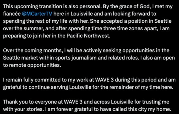 Madeline Carter came to KING 5 in June 2025. Now, her husband, WAVE/Louisville Sports anchor, Dusty Baker, is leaving that city for Seattle. He will be looking at opportunities here as he reunites with Madeline.