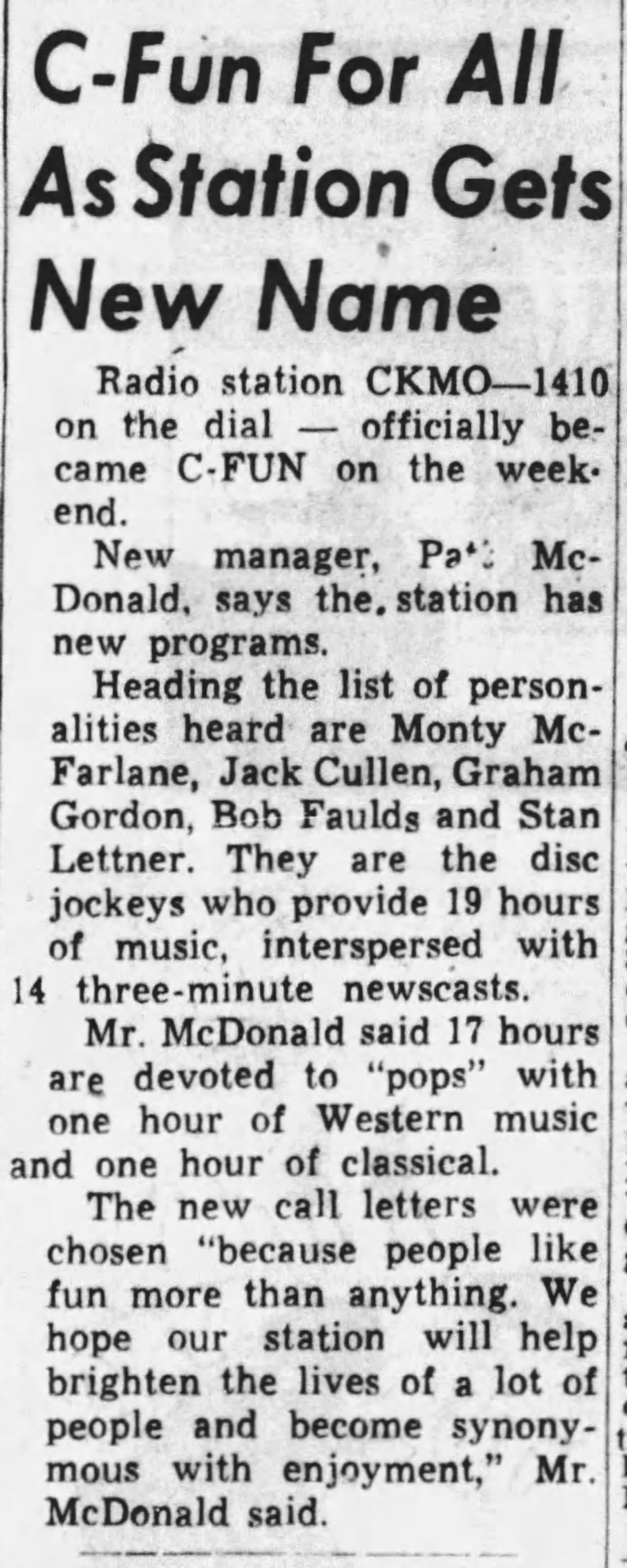 Four years later, in 1928, CFCQ was renamed CKMO, and increased its power from 100 to 1000 watts!