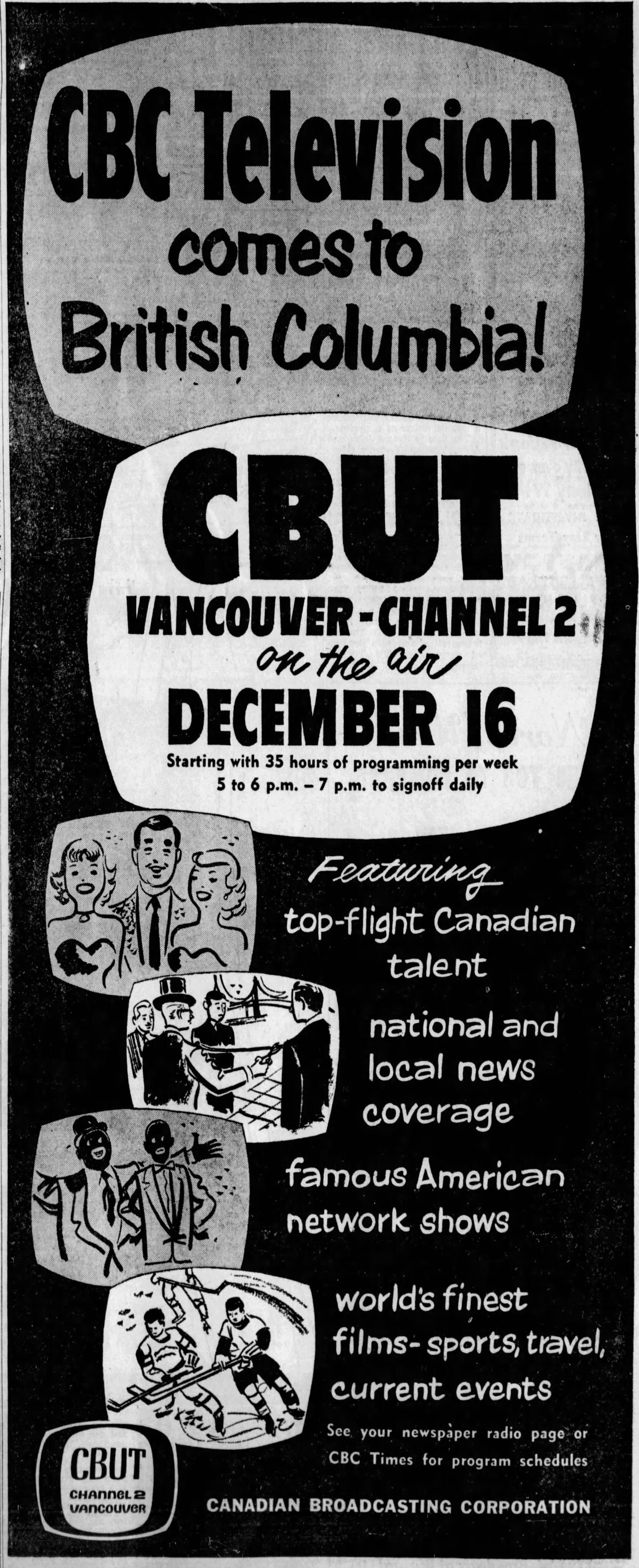 June 22, 1953 – KVOS/Bellingham goes on the air, for one to two hours each evening. The schedule slowly expanded over the following months. By January 1954, KVOS was broadcasting six hours of programming most days.
