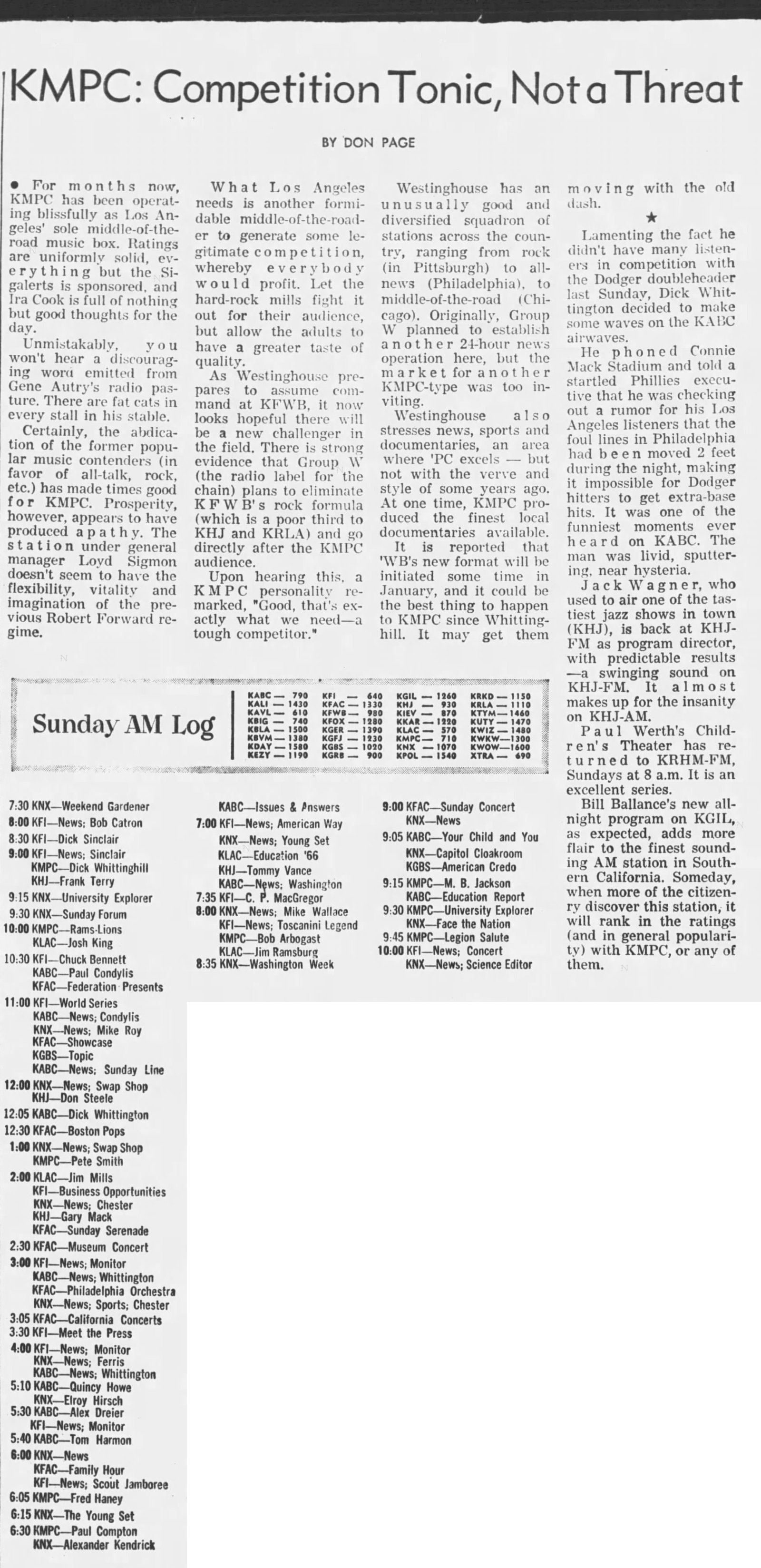 KMPC readies for competition Jason Remington March 4, 2026 October 1966 – Los Angeles Times Share this post: Jason Remington(((Admin/Editor | Airchecks | CONTACT))) KTOY (WA) | KVAC (WA) | KDFL (WA) | KONP (WA) | KBAM (WA) | KJUN (WA) | KRPM (WA) | KAMT (WA) | KASY (WA) | KBRD (WA) | KTAC (WA) | KMTT (WA) | KOOL (AZ)
