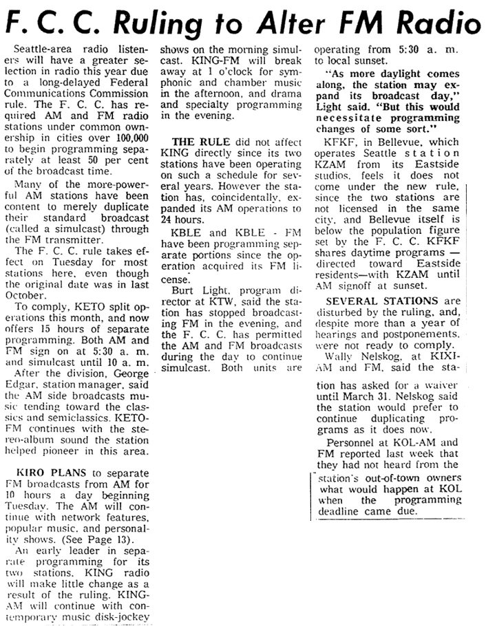 Station owners see cost rather than opportunity in AM-FM split Jason Remington February 6, 2025 January 30, 1966 – Seattle Times Share this post: Jason Remington(((Admin/Editor | Airchecks | CONTACT))) KTOY (WA) | KVAC (WA) | KDFL (WA) | KONP (WA) | KBAM (WA) | KJUN (WA) | KRPM (WA) | KAMT (WA) | KASY (WA) | KBRD (WA) | KTAC (WA) | KMTT (WA) | KOOL (AZ)
